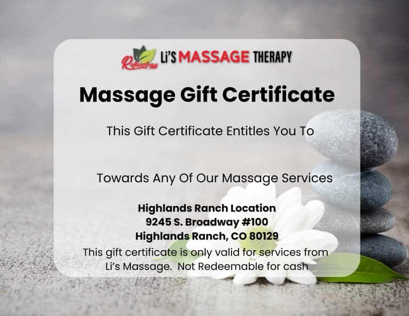 Give someone the gift they actually want — relief. A gift certificate from Li’s Massage Therapy & Reflexology lets them choose from full body massage, reflexology, Thai massage, couples massage, and more at either our Centennial or Highlands Ranch location.